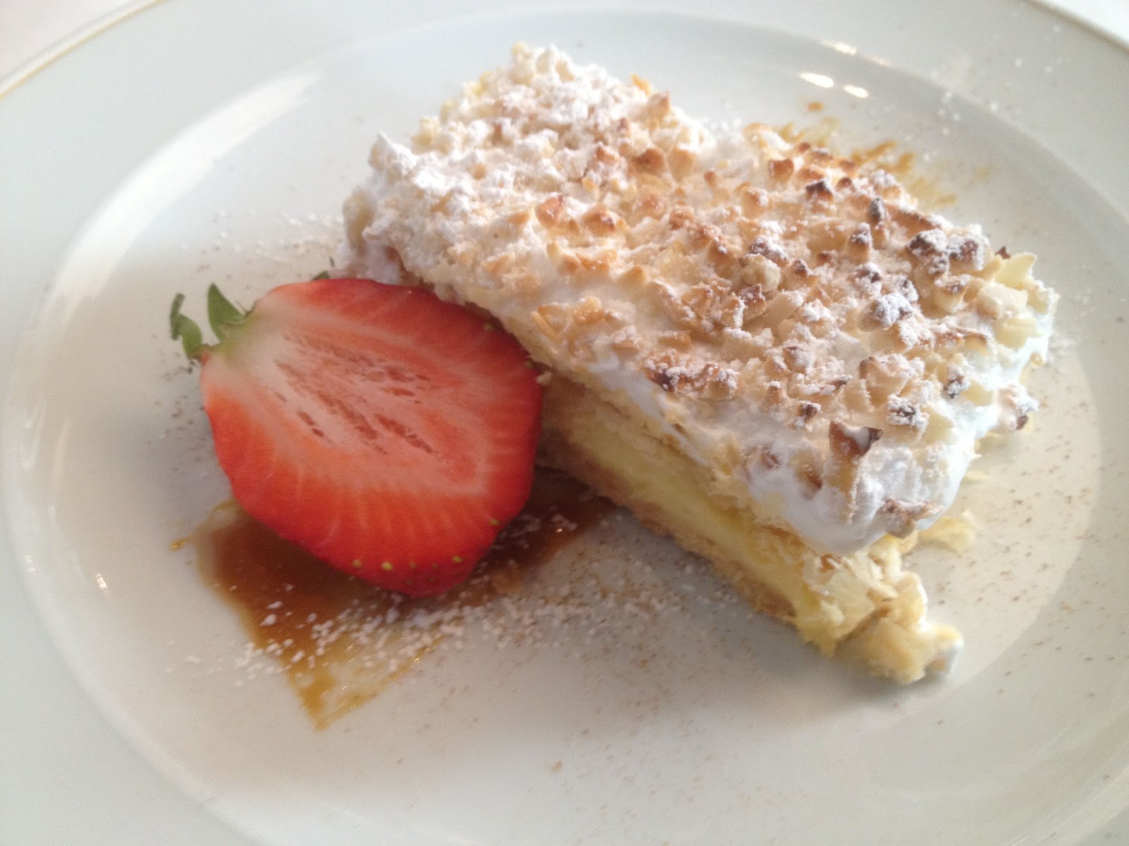 Y para terminar y permitirnos abandonar el Parador con sabor dulce nos regalan los sentidos con una Costrada de Alcalá (milhojas de hojaldre con merengue y almendras) el crujiente aportado por la almendra se funde con las suaves obleas de hojaldre, la crema y el delicioso merengue.