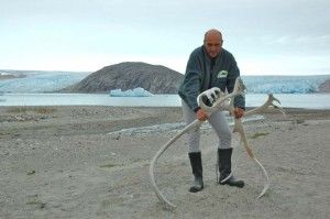 Uno se puede dar cuenta del gran tamaño del caribú comparando en esta fotografía su fantástica cornamenta con mi altura (1,80 m.) que solo hasta el lomo pueden llegar a una altura de 1,50 m. Dispersadas por las montañas en fácil encontrarse con estas cornamentas, y eso es debido a que el caribú es la única especie de venado que tanto en el caso de los machos como de las hembras pueden tener cornamenta.