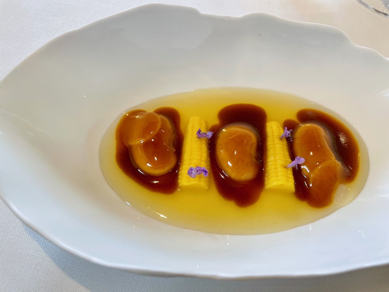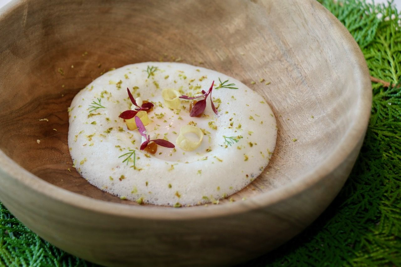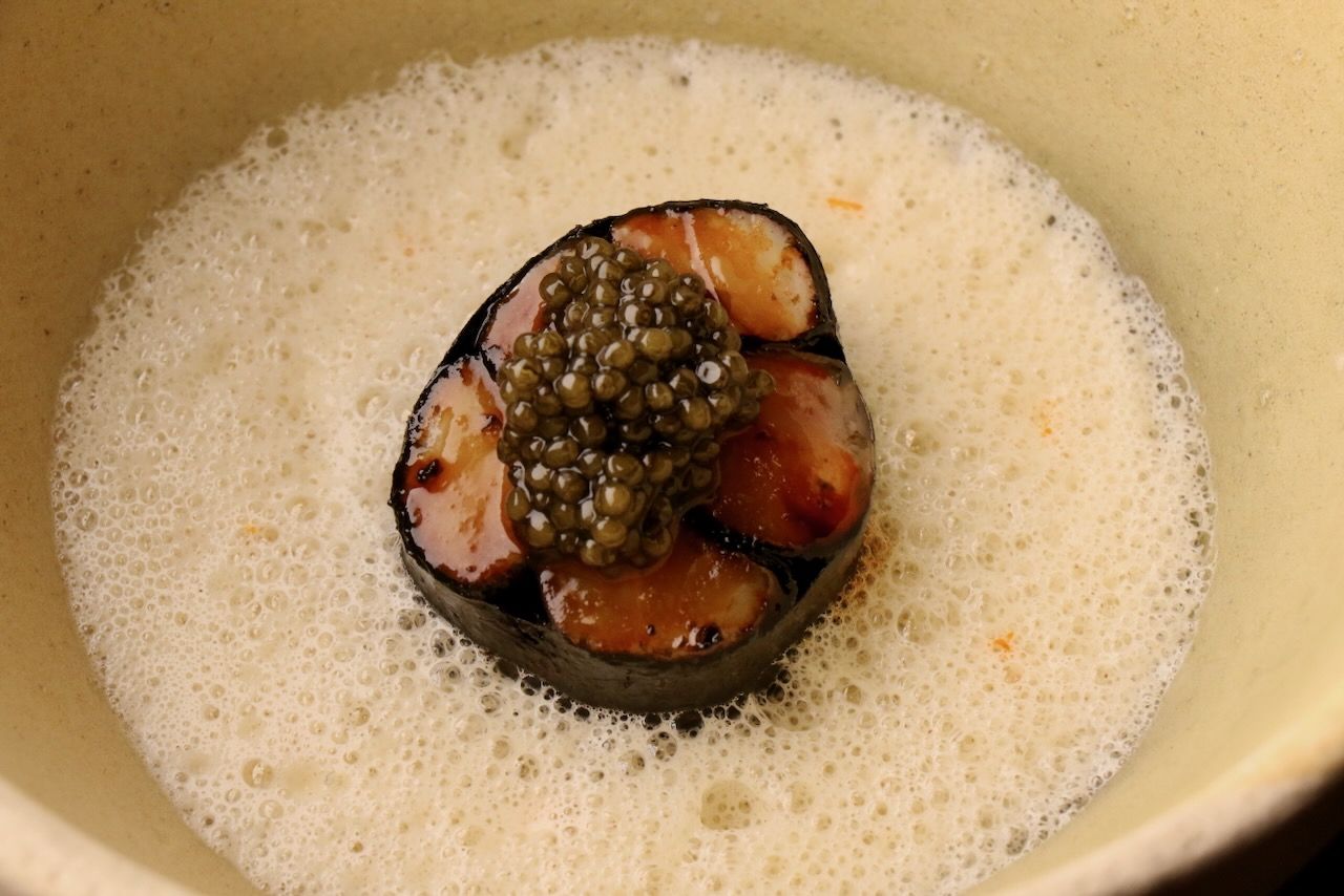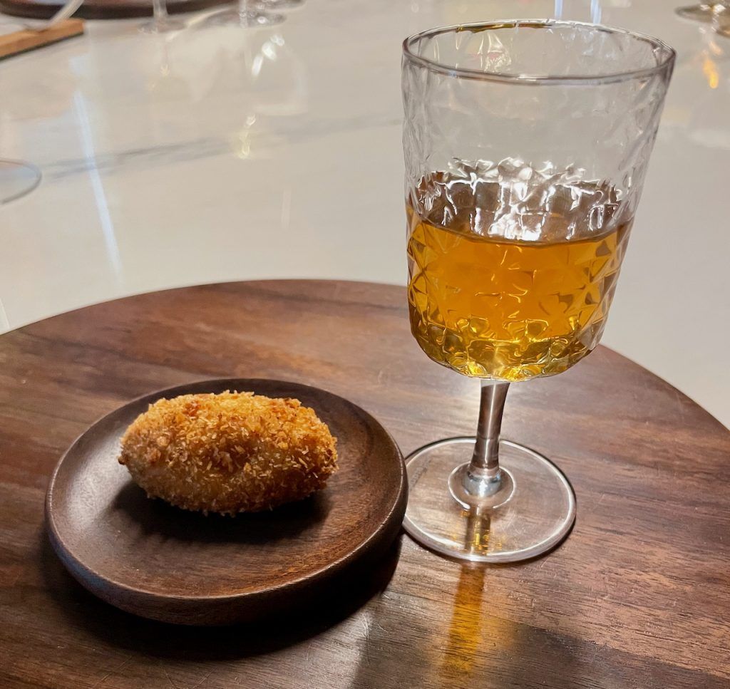 A veces la apertura de un menú degustación de un tres Estrellas Michelin abre con una de las especialidades de la cocina española como es una humilde croqueta, que se puede elevar a la alta cocina como es el caso de la de Jesús Sánchez, que acompaña con su caldo de cocido para que la experiencia toque el cielo.