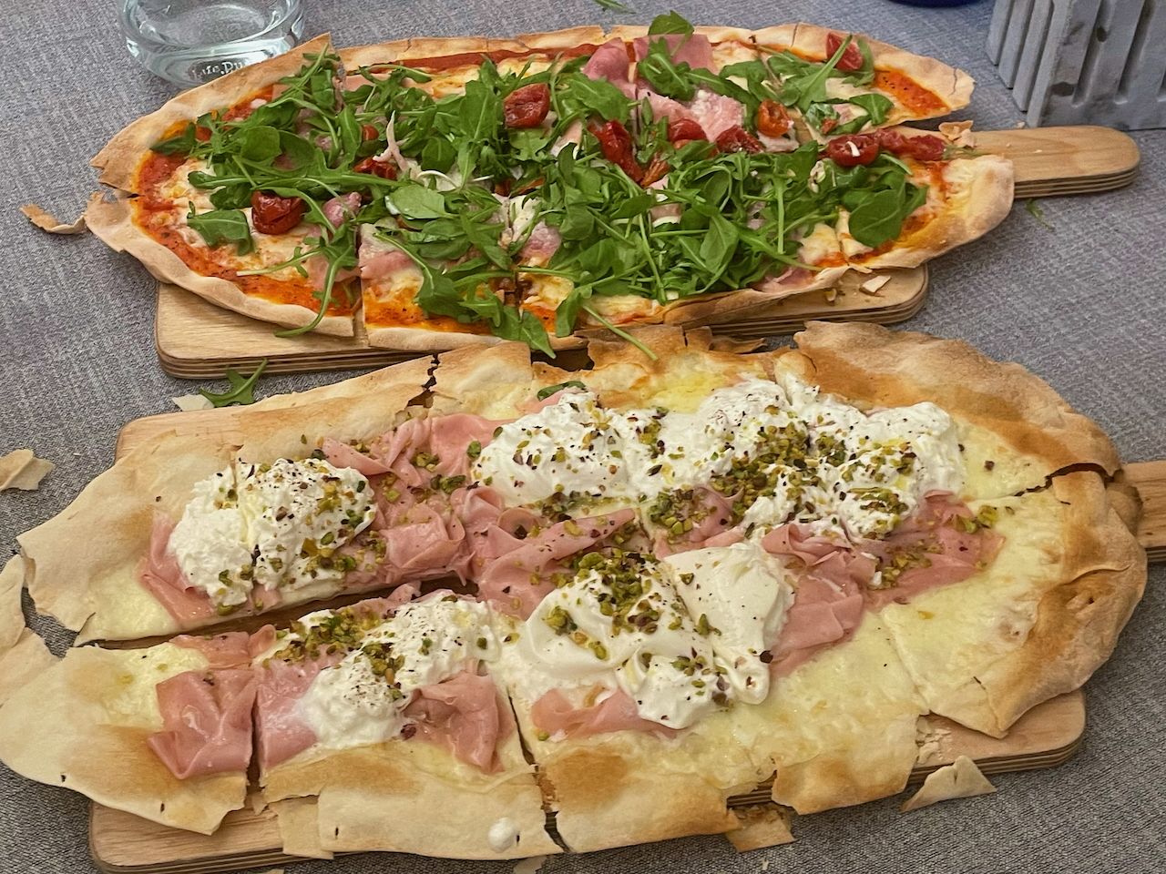 También es raro el año que no paso por Manzoni, en este caso quise que fuera el post en homenaje al padre de Stefano Carta. Aunque su carta descubre arroces, pastas y carnes, sus pizzas son mi debilidad porque comer pizzas sardas en Madrid es muy difícil y son mis preferidas, amigos míos del resto de Italia no os enfadéis pero debo ser sincero. Ese día fueron la Pizza MANZONI de Prosciutto cotto, tomate fresco, mozzarella, pecorino, tomate semiseco y rúcula, y la Pizza Mortadella e pistacho con Burrata e granola de pistacho.